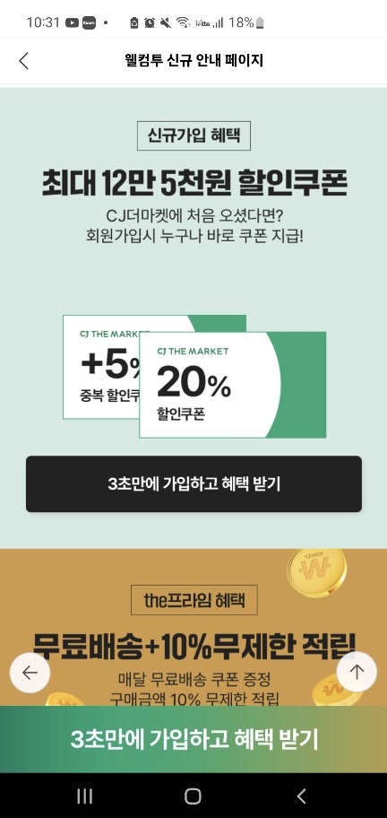 김밥 한 줄이 5천 원 이 넘어가는 요즘, 한 달 식비 비용도 만만치가 않습니다. 그래서 집밥을 해 먹으려고 해도 야채값이며 밀가루 값이며 다 올라서 조금만 담아도 5만 원이 훌쩍 넘어버립니다. 그럴 땐 포인트와 할인쿠폰을 이용하게 무료 또는 저렴하게 장을 보면 됩니다. 먼저 아래 "CJ 더마켓 앱 설치하기"를 통해서 앱을 설치해 주시길 바랍니다.