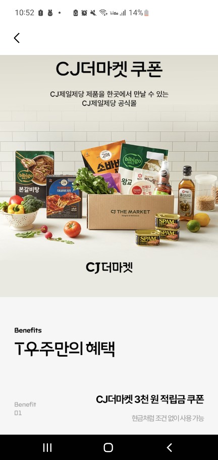 T우주패스앱에서 무료로 T우주패스 free를 이용할 수 있는데, 기본 선택 상품중에서 "CJ더마켓 3천 원 적립금" 받기가 있습니다. 이 적립금 쿠폰을 CJ더마켓에 등록하여 사용하면 됩니다.