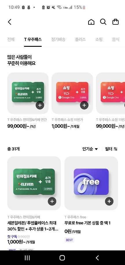 2. 하단 카테고리 -T우주패스 Free - CJ더마켓 3천 원 적립금 선택